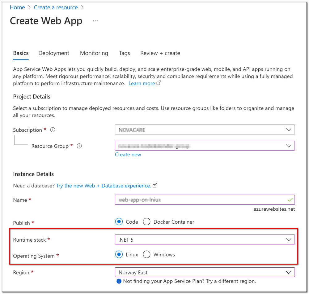 In the Azure portal, create a Web App, selecting .NET 5 as the runtime and Linux as the operating system.